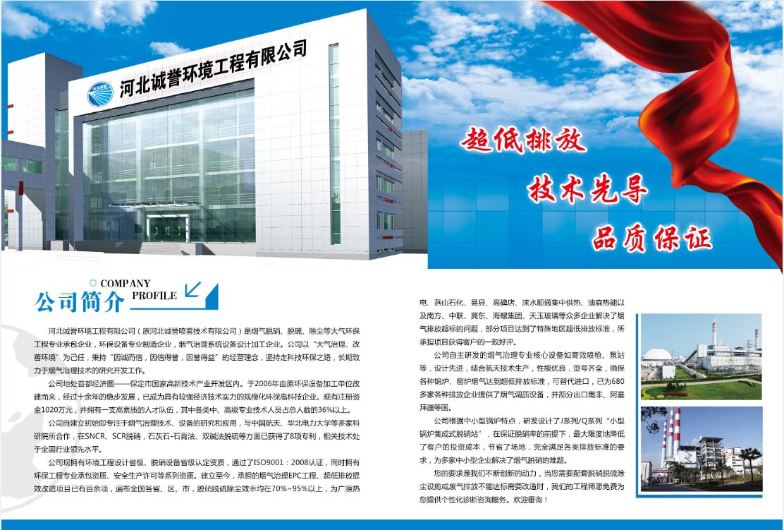 河北誠譽環境工程有限公司(原河北誠譽噴霧技術有限公司)是一家專業從事煙氣脫硫脫硝的高科技環保企業。公司擁有近二十年霧化經驗,主要業務領域包括:SCR、SNCR脫硫脫硝系統設計、脫硝工程承包,各種規格型號脫硫脫硝噴槍噴嘴、霧化噴嘴噴槍的研發、生產及銷售。產品廣泛應用于電力、水泥、化工、食品、制藥等行業。